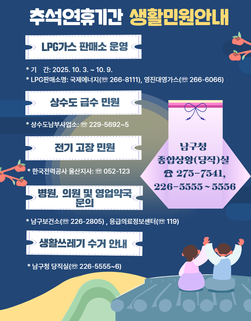 우리 울산 남구는 구민 여러분께서 안전하고 편안한 추석 연휴를 보내실 수 있도록