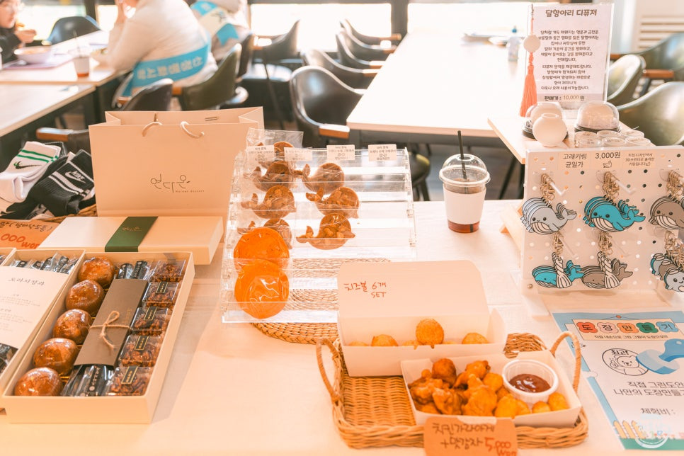 울산의 캐릭터로 자리 잡은 고래 모양으로 만들어진 쿠키부터 어른과 아이가 모두 좋아하는 치즈볼과 떡볶이까지 있어서 어떤 걸 먹어야 할지 고민이 되었답니다.