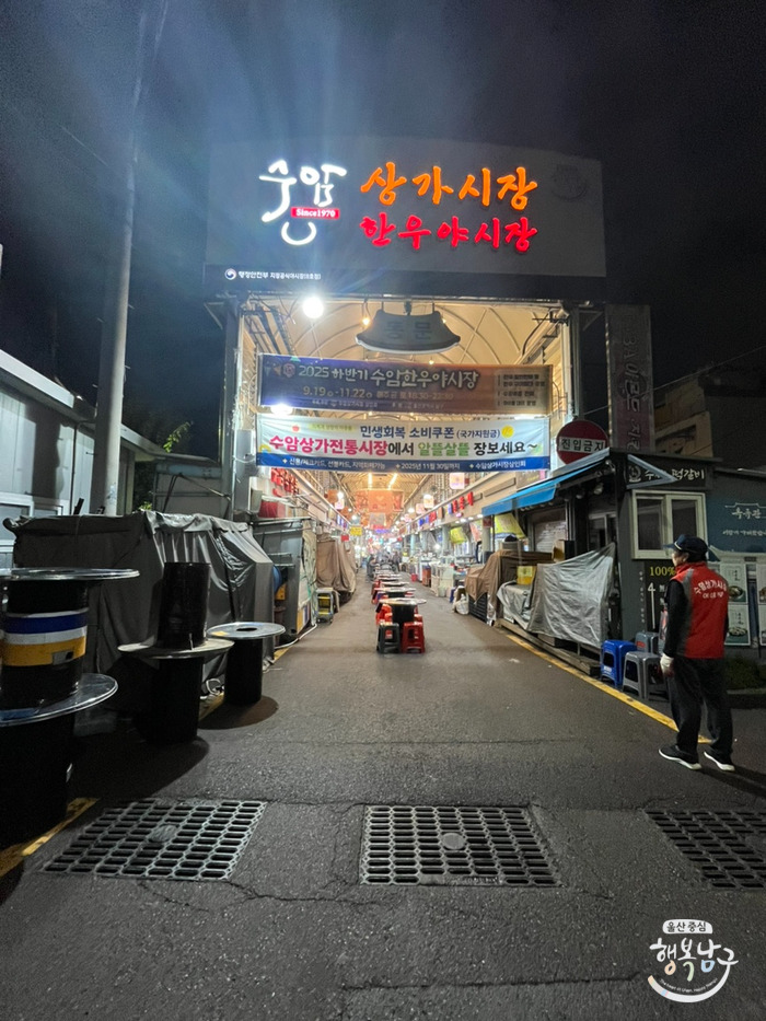 2025 하반기 수암한우야시장 개장을 알리는 현수막이 게시되어 있죠?