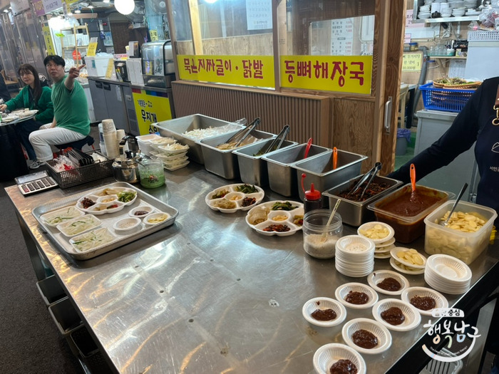 시장 통로에 원형 테이블 좌악~~ 깔아 놓고 상차림 준비하고 있습니다. 1인당 상차림비 6천 원이면 금세 준비가 된답니다.