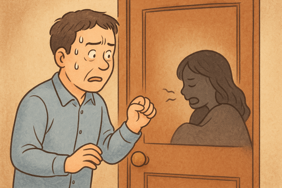 침실 문 앞에서 한참을 망설인 끝에 조심스레 문을 두드립니다.