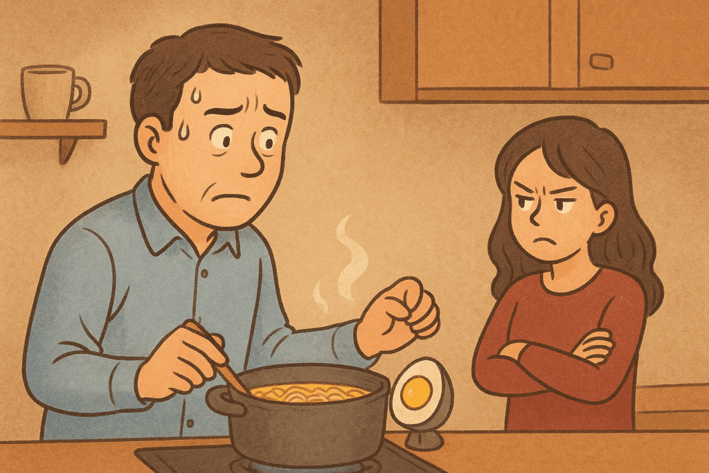 냄비를 올리고, 수프를 붓고, 면을 투하하는 그 짧은 순간에도