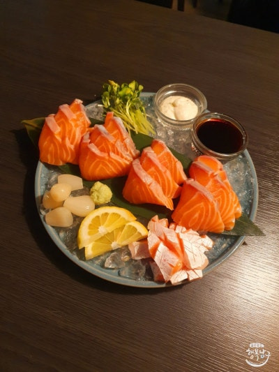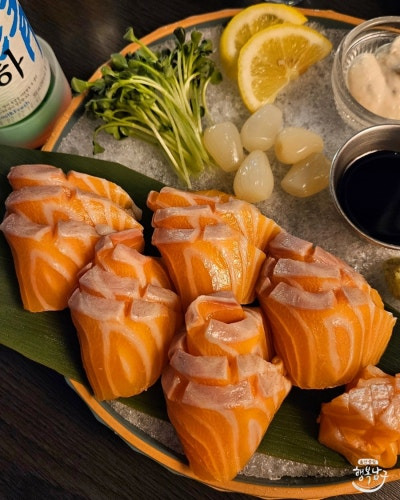 인기 있는 메뉴로는 연어 사시미, 아부리육회,