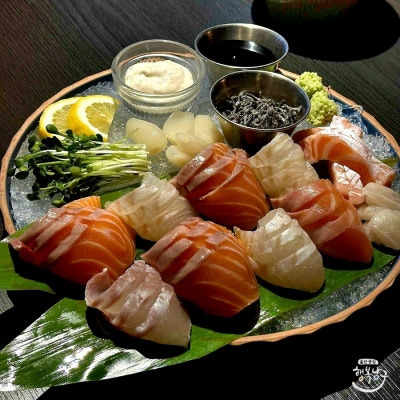 – 연어 사시미: 다시마 청주로 숙성시켜 감칠맛을 더했습니다.