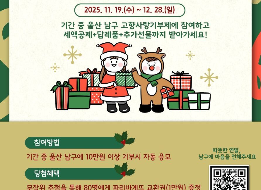💌 울산 남구, 연말정산 시즌 맞아 ‘고향사랑기부제’ 특별 이벤트 진행