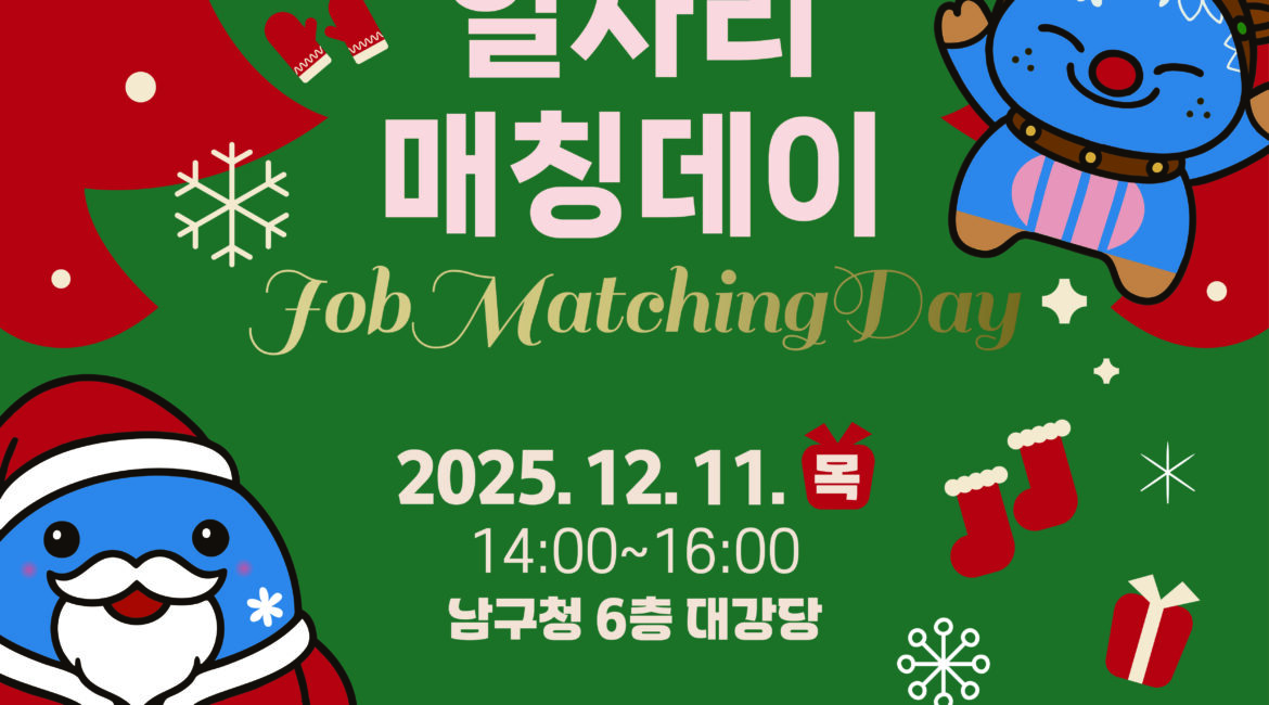 희망찬 새 출발을 위한 발걸음, 남구에서 시작하세요! 👣 「제12회 일자리매칭데이」 개최로 당신의 꿈을 응원합니다! 2025년 한 해의 끝자락, 새로운 도약을 꿈꾸는 여러분을 위해 울산 남구에서 특별한 취업의 장을 마련합니다. 단순한 면접을 넘어 미래를 체험하고 준비하는 '종합 취업 페스티벌'이 여러분을 찾아갑니다! ✔ 언제 어디서 만나나요? 😊 📅 일시: 2025년 12월 11일(목)...