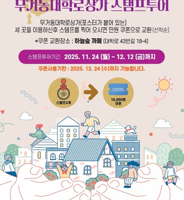 2025 골목상권 부활 프로젝트 6탄! 울산 남구는 지역 골목상권에 활력을 불어넣기 위한 ‘2025 골목상권 부활 프로젝트’의 여섯 번째 행사로, 무거동 울산과학대학교 인근에서 「무거동대학로상가 스탬프 투어」 소비촉진 행사를 진행하고 있습니다. 이번 행사는 지난 11월 24일부터 12월 12일까지 3주간 이어지며, 무거동대학로상가번영회가 직접 기획하고 추진한다는 점에서 더욱 의미가 깊습니다. 무거동 울산과학대학교 옆 상권은...