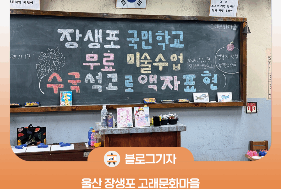장생포 고래문화마을은 주차장에서 조금만 걸어오시면 입구가 있어요. 고래문화마을 간판 아래쪽에 매표소가 있어서 매표하시고 마을 안으로 입장해 주시면 돼요. 장생포 국민학교 미술교실은 2023년부터 매주 토요일마다 진행된 어린이 미술체험 프로그램이에요. 25년 5월부터는 인기가 많아서 10월까지 토일로 확대되어 운영하고 있어요. 1~12월 까지는 매주 토요일 운영하고요. 5월~10월 사이에는 매주 일요일도 함께 운영해요....