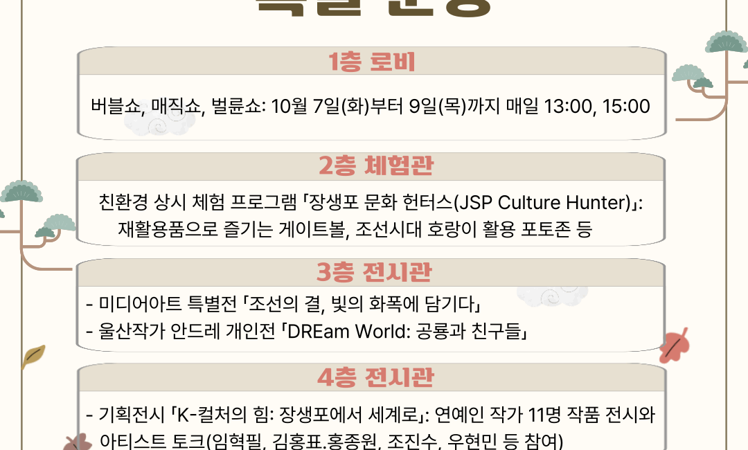 고래문화재단이 준비한 장생포문화창고 추석연휴 특별 운영으로 올 추석은 더욱 풍성해집니다! 🍁 귀향객과 가족 단위 방문객 모두가 함께 즐길 수 있도록 전통과 현대가 어우러진 다채로운 프로그램들을 마련했답니다. ❍ 운영기간: 10월 3일(목)부터 10월 9일(수)까지(추석 당일 10월 6일은 휴무) 🌟 놓칠 수 없는 주요 프로그램 🌟 ✅ 4층 특별 기획전시: 「K-컬처의 힘: 장생포에서...